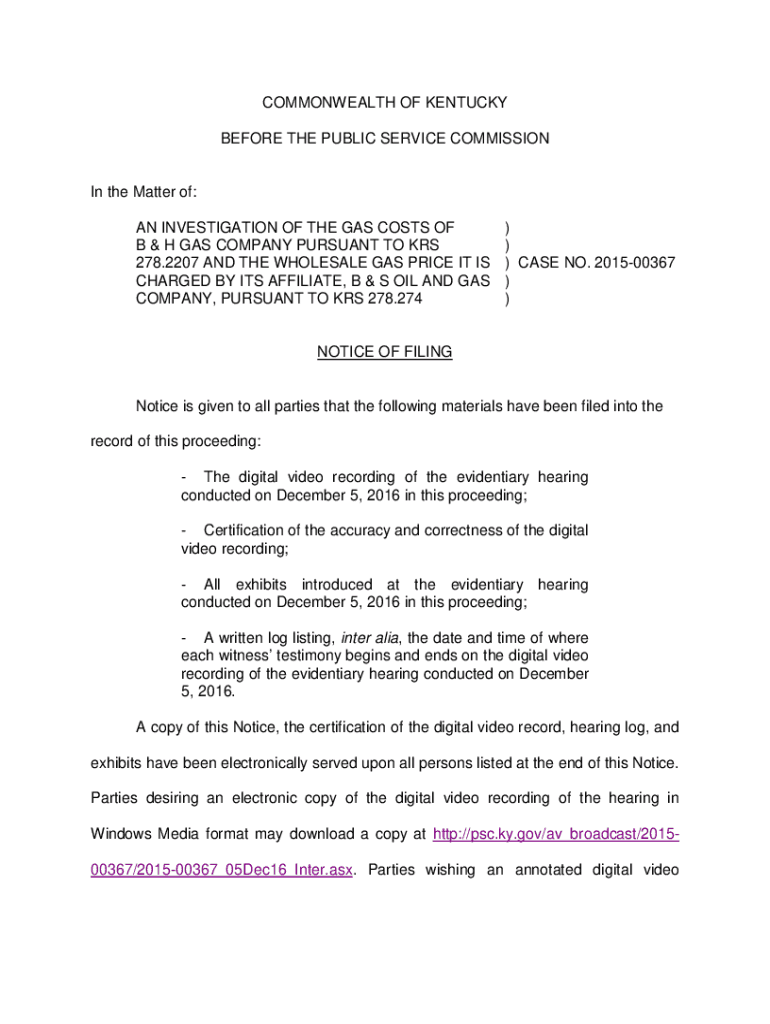 COMMONWEALTH OF KENTUCKY BEFORE THE PUBLIC SERVICE Commissioning the Matter of: AN INVESTIGATION OF THE GAS COSTS OF B & H GAS COMPANY PURSUANT TO MRS 278.2207 AND THE WHOLESALE GAS PRICE IT IS CHARGED