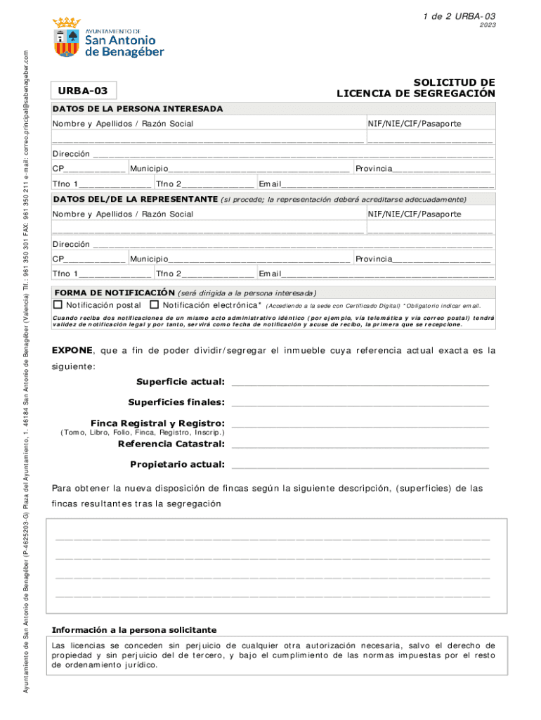 1 DE 2 URBA03Ayuntamiento de San Antonio de Benagber (P4625203G) Plaza del Ayuntamiento, 1. 46184 San Antonio de Benagber (Valencia) TLF.: 961 350 301 FAX: 961 350 211 email: core.principal@sabenageber.com2023SOLICITUD