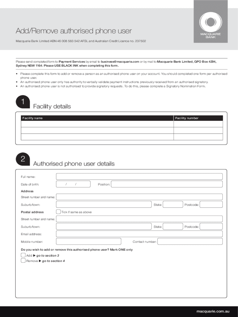Add/Remove authorized phone user Macquarie Bank Limited ABN 46 008 583 542 ADSL and Australian Credit License no. 237502Please send completed form to Payment Services by email to business@macquarie.com