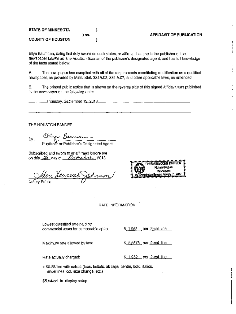 STATE OF MINNESOTA)) SS. COUNTY OF HOUSTONAFFIDAVIT OF PUBLICATION)Ellen Baumann, being first duly sworn on oath states, or affirms, that she is the publisher of the newspaper known as The Houston