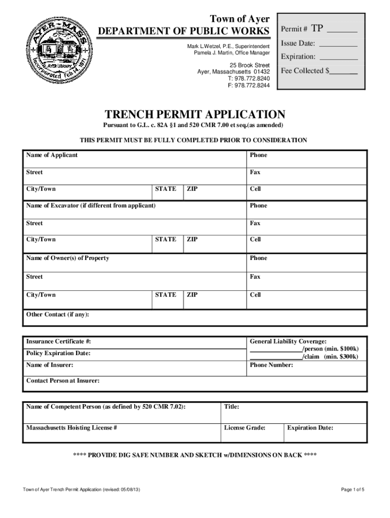 Town of Layer DEPARTMENT OF PUBLIC WORKS Mark L. Wetzel, P.E., Superintendent Pamela J. Martin, Office Manager25 Brook Street Layer, Massachusetts 01432 T: 978.772.8240 F: 978.772.8244Permit #TP___Issue