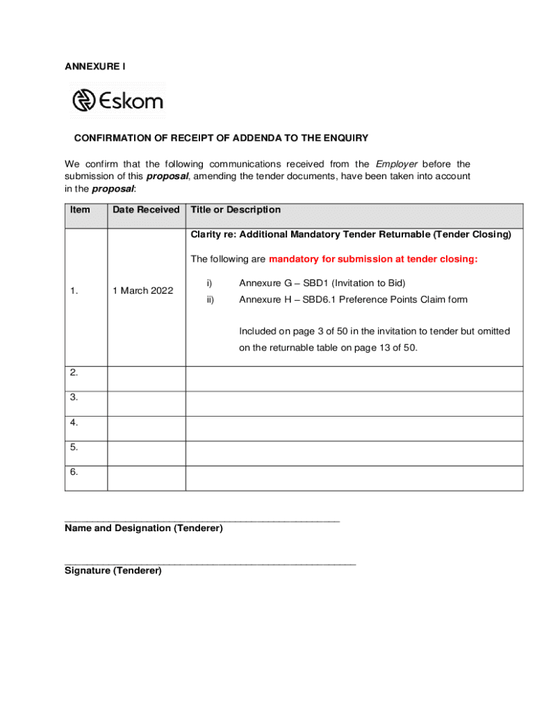 Appendix CONFIRMATION OF RECEIPT OF ADDENDA TO THE Inquiry We confirm that the following communications received from the Employer before the submission of this proposal, amending the tender documents,