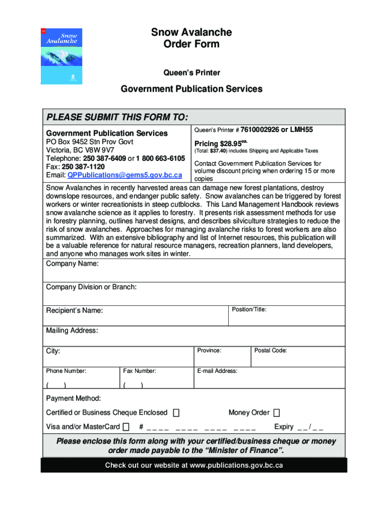Snow Avalanche Order Form Queens PrinterGovernment Publication Services PLEASE SUBMIT THIS FORM TO: Queens Printer # 7610002926Government Publication Services PO Box 9452 STN Prov Govt Victoria, BC