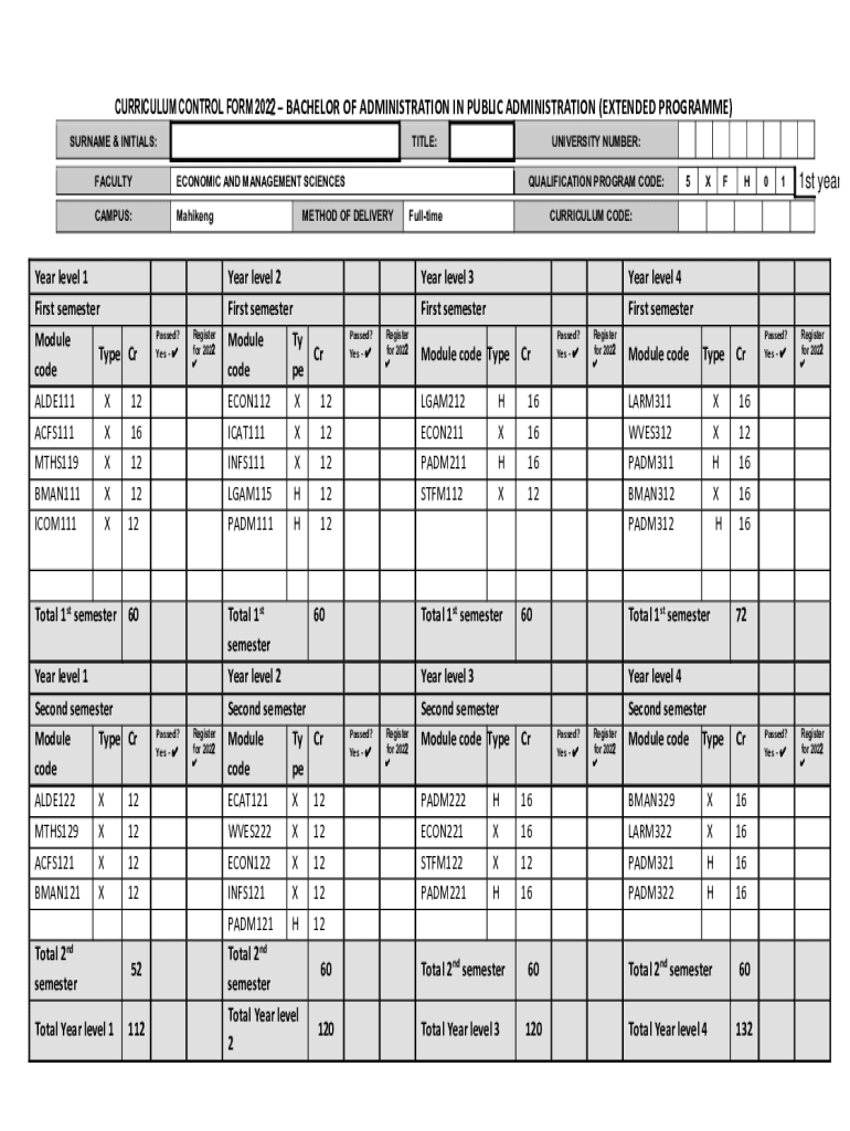 CURRICULUM CONTROL FORM 2022 BACHELOR OF ADMINISTRATION IN PUBLIC ADMINISTRATION (EXTENDED Program)