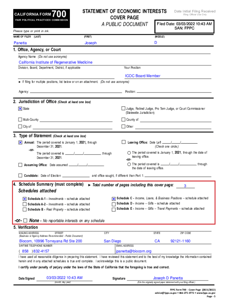 CALIFORNIA Formfitting Received STATEMENT OF ECONOMIC INTERESTS Date Initial Filing Official Use Only COVER PAGE Filed Date: 03/03/2022 10:43 AM A PUBLIC DOCUMENT700FAIR POLITICAL PRACTICES COMMISSION
