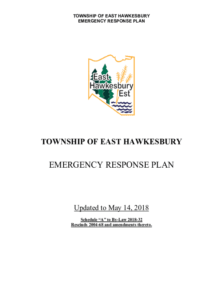 TOWNSHIP OF EAST TEWKESBURY EMERGENCY RESPONSE PLANTOWNSHIP OF EAST HAWKESBURYEMERGENCY RESPONSE PLANUpdated to May 14, 2018, Schedule A to Bylaw 201832 Rescinds 200468 and amendments thereto. TOWNSHIP