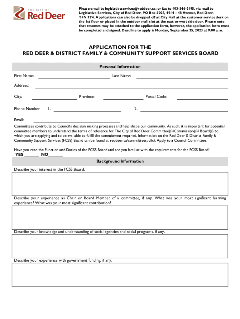 Please email to legislativeservices@reddeer.ca; or fax to 4033466195, via mail to Legislative Services, City of Red Deer, PO Box 5008, 4914 48 Avenue, Red Deer, T4N 3T4. Applications can also be dropped