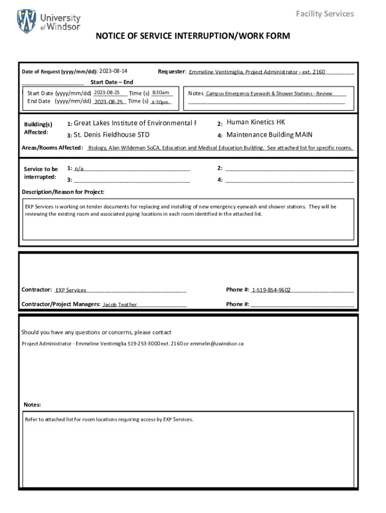 Facility ServicesNOTICE OF SERVICE INTERRUPTION/WORK Format of Request (YYY/mm/dd): 20230814___Requester: ___