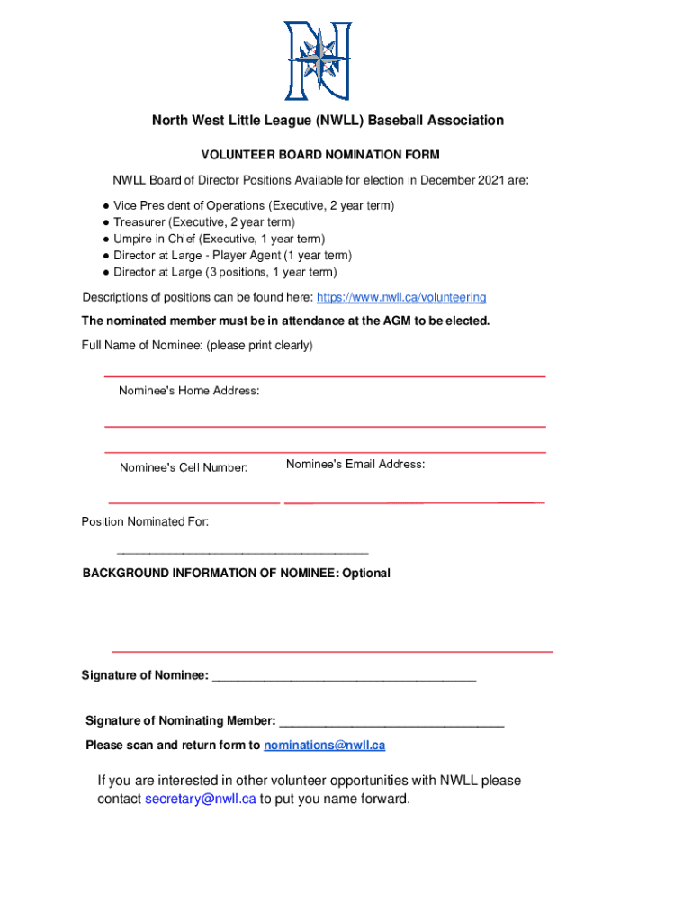 North West Little League (NULL) Baseball Association VOLUNTEER BOARD NOMINATION FORM NULL Board of Director Positions Available for election in December 2021 are: Vice President of Operations (Executive,