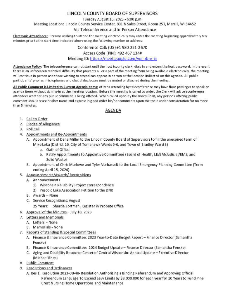 LINCOLN COUNTY BOARD OF SUPERVISORS Tuesday, August 15, 2023 6:00 p.m. Meeting Location: Lincoln County Service Center, 801 N Sales Street, Room 257, Merrill, WI 54452Via Teleconference and Unperson