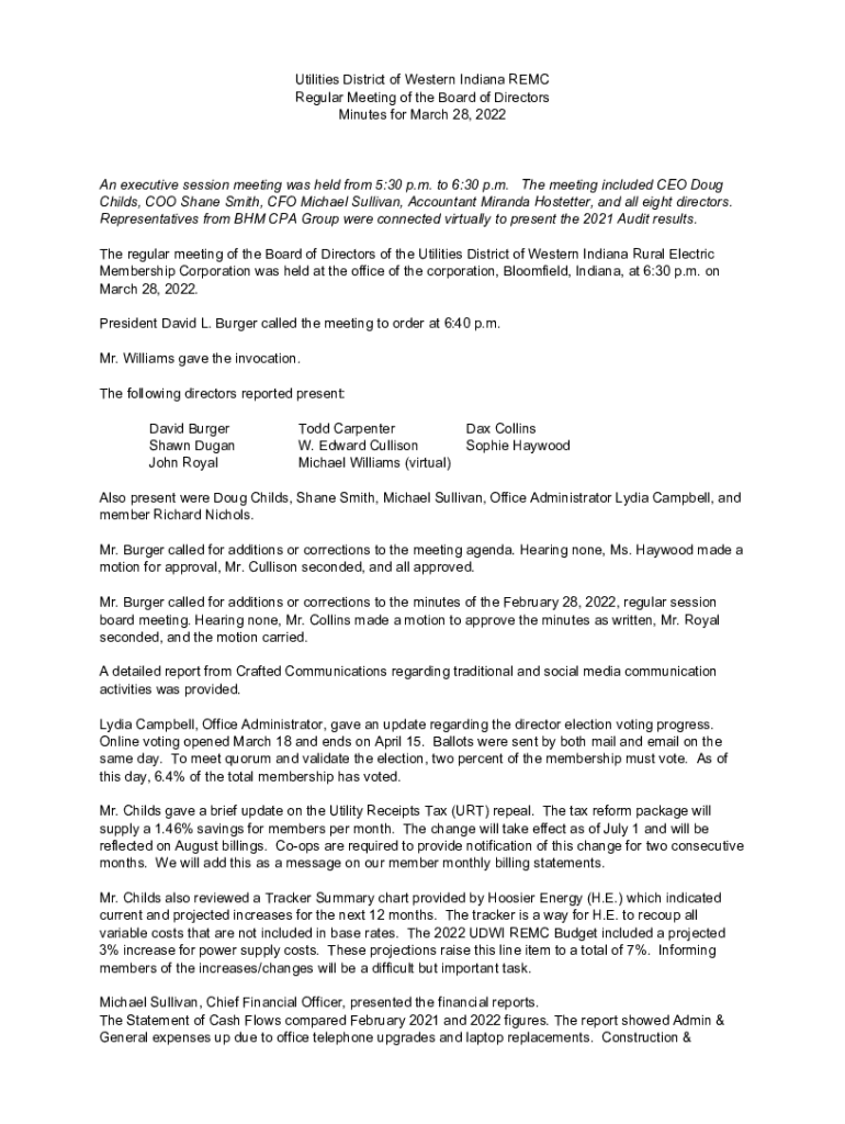 Utilities District of Western Indiana REM Regular Meeting of the Board of Directors Minutes for March 28, 2022An executive session meeting was held from 5:30 p.m. to 6:30 p.m. The meeting included
