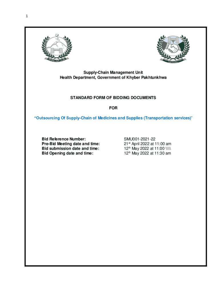 1SupplyChain Management Unit Health Department, Government of Khyber PakhtunkhwaSTANDARD FORM OF BIDDING DOCUMENTS FOR Outsourcing Of SupplyChain of Medicines and Supplies (Transportation services)Bid