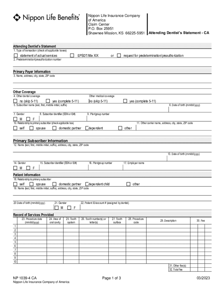 Nippon Life Insurance Company of America Claim Center P.O. Box 25951 Shawnee Mission, KS 662255951 Attending Dentists Statement CA Attending Dentists Statement 1. Type of transaction (check all applicable