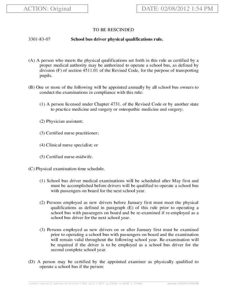 ACTION: Originate: 02/08/2012 1:54 PTO BE RESCINDED 33018307School bus driver physical qualifications rule.(A) A person who meets the physical qualifications set forth in this rule as certified by