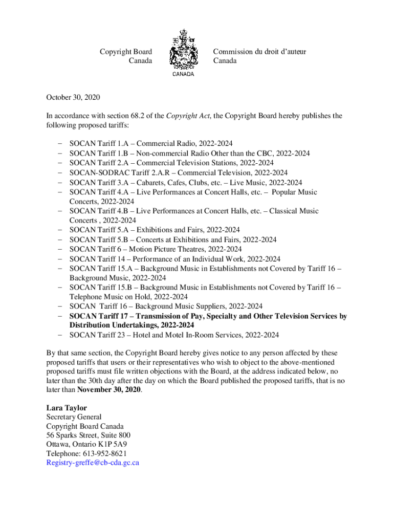 In accordance with section 68.2 of the Copyright Act, the Copyright Board hereby publishes the