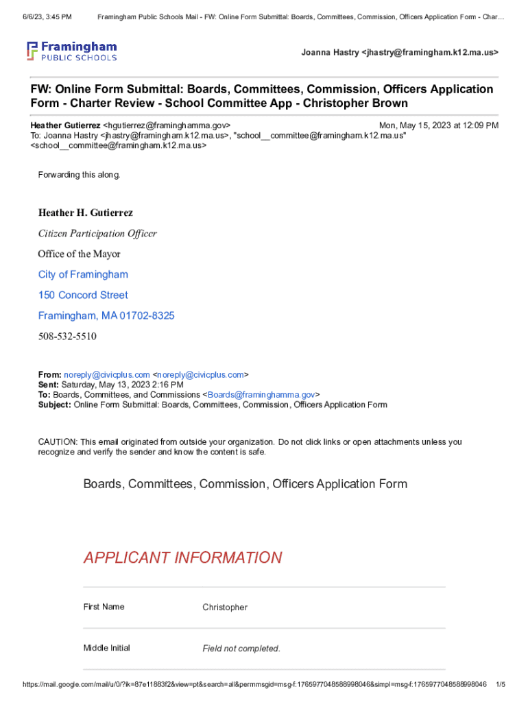 6/6/23, 3:45 PM Framingham Public Schools Mail FW: Online Form Submittal: Boards, Committees, Commission, Officers Application Form Char Joanna Pastry jhastry@framingham.k12.ma.usFW: Online Form Submittal: