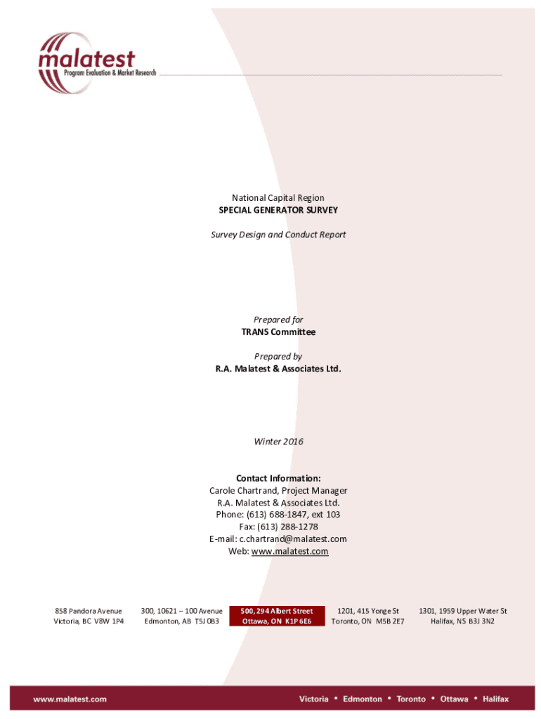 National Capital Region SPECIAL GENERATOR SURVEY Design and Conduct ReportPrepared for TRANS Committee Prepared by R.A. Malatest & Associates Ltd. Winter 2016Contact Information: Carole Chart rand,