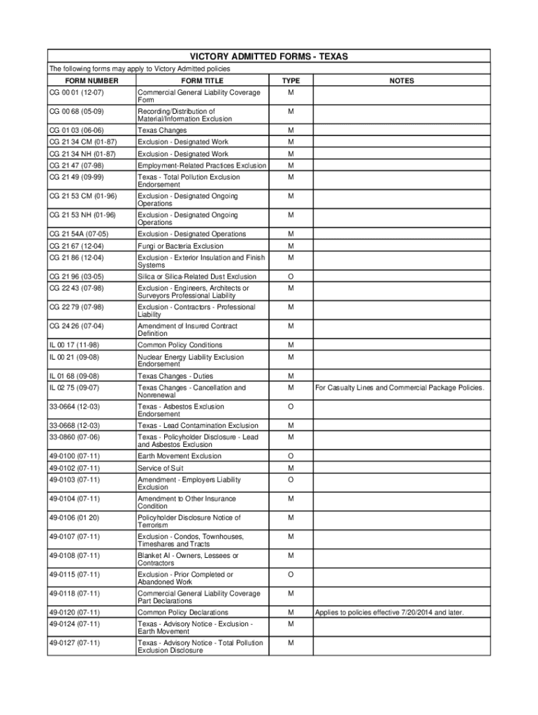 VICTORY ADMITTED FORMS TEXAS The following forms may apply to Victory Admitted policies FORM OUTPERFORM TITLETYPECG 00 01 (1207)Commercial General Liability Coverage Form MCG 00 68 (0509)Recording/Distribution