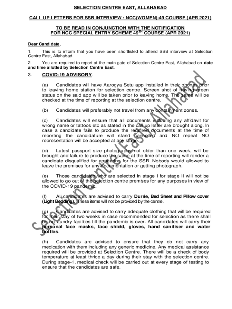 SELECTION Center EAST, ALLAHABAD Calls UP LETTERS FOR SSB INTERVIEW : NCC(WOMEN)49 COURSE (APR 2021) TO BE READ IN CONJUNCTION WITH THE NOTIFICATION FOR NCC SPECIAL ENTRY SCHEME 49TH COURSE (APR 2021)