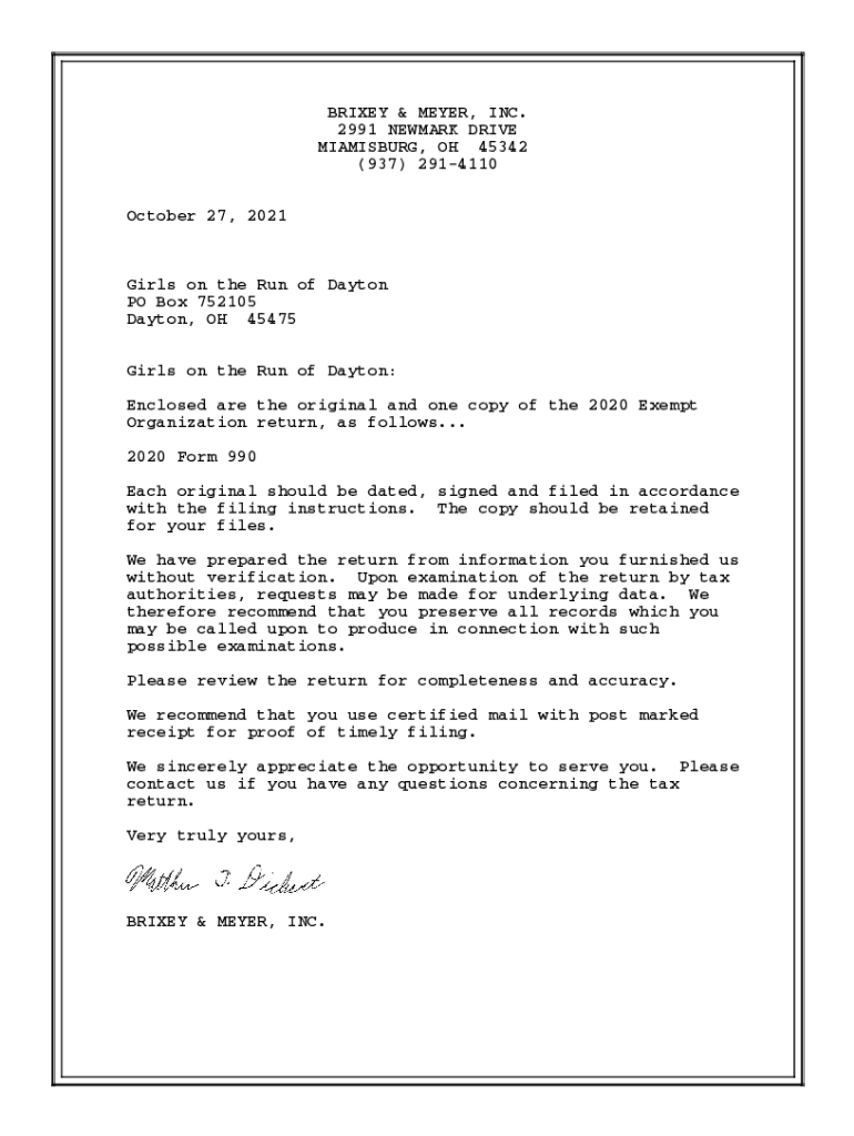 BRILEY & MEYER, INC. 2991 NEWARK DRIVE MIAMISBURG, OH 45342 (937) 2914110 October 27, 2021Girls on the Run of Dayton PO Box 752105 Dayton, OH 45475 Girls on the Run of Dayton: Enclosed are the original