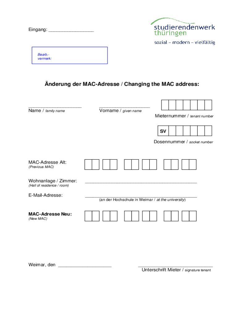 Das Formular zur Änderung der MAC-Adresse sollte die aktuellen und neuen MAC-Adressen sowie die Gründe für die Änderung enthalten. Oft müssen auch Informationen über das betroffene Gerät und den Verantwortlichen angegeben werden.