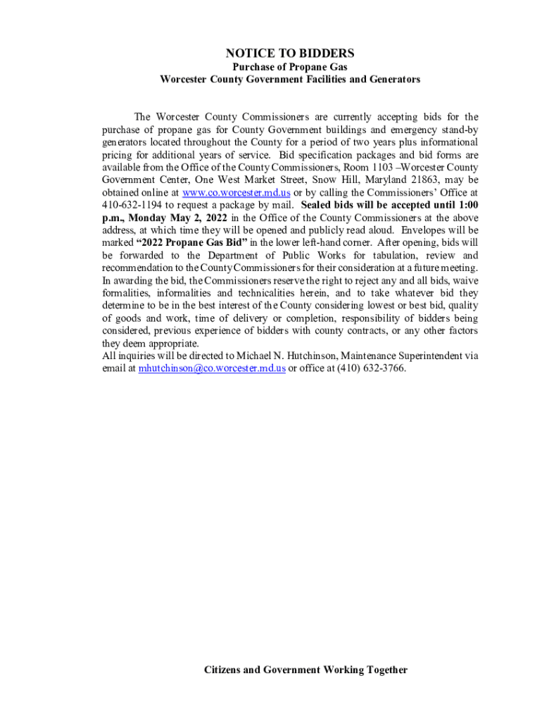 NOTICE TO BIDDERSPurchase of Propane Gas Worcester County Government Facilities and Generators The Worcester County Commissioners are currently accepting bids for the purchase of propane gas for County
