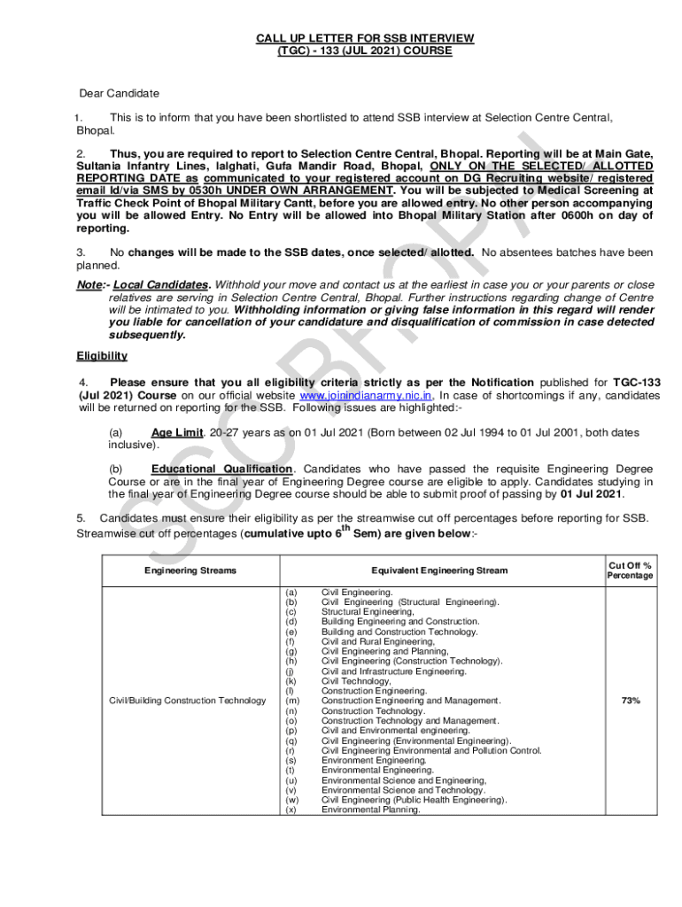 CALL UP LETTER FOR SSB INTERVIEW (NGC) 133 (JUL 2021) COURSED ear Candidate This is to inform that you have been shortlisted to attend SSB interview at Selection Center Central, Bhopal.1.2. Thus,