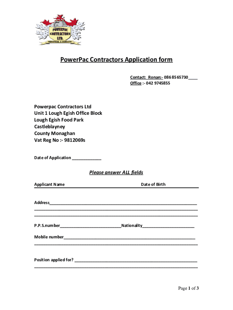 PowerPC Contractors Application form Contact: Roman: 086 8565730 Office : 042 9745855Powerpac Contractors Ltd Unit 1 Lough Gish Office Block Lough Gish Food Park Castleblayney County Jonathan Vat
