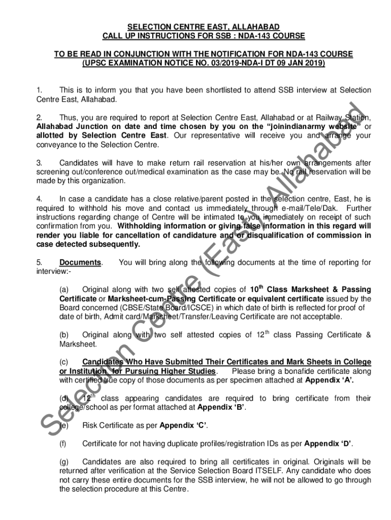 Candidates who are required to undergo selection procedures at Selection Centre East Allahabad