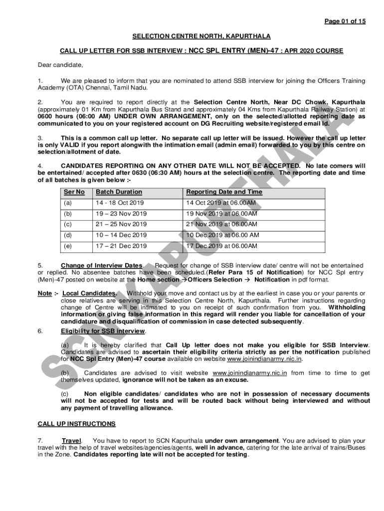 Page 01 of 15 SELECTION Center NORTH, KAPURTHALA CALL UP LETTER FOR SSB INTERVIEW : NCC SPL ENTRY (MEN)47 : APR 2020 COURSE Dear candidate, 1. We are pleased to inform that you are nominated to attend