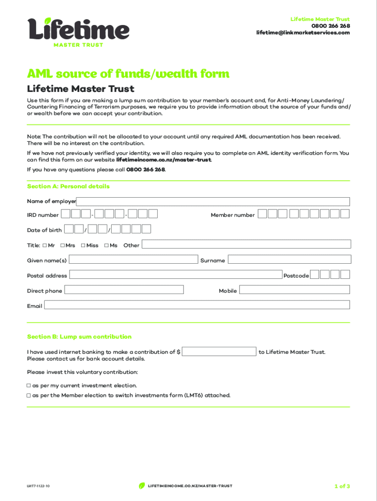 Lifetime Master Trust 0800 266 268 lifetime@linkmarketservices.comAML source of funds/wealth form Lifetime Master Trust Use this form if you are making a lump sum contribution to your members account
