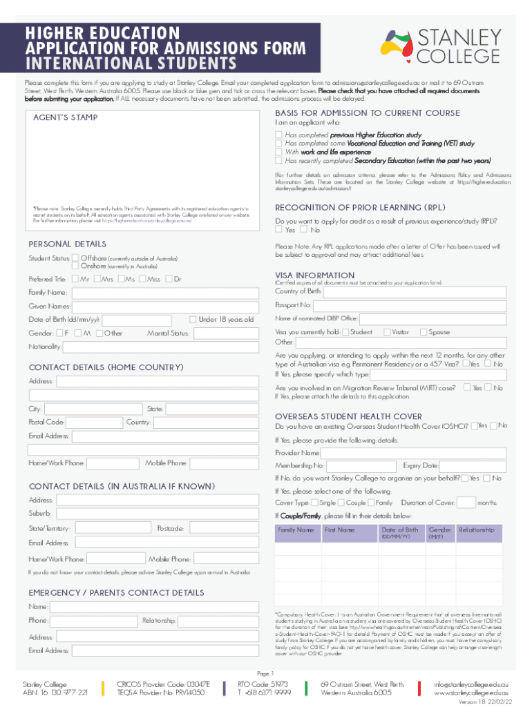 HIGHER EDUCATION APPLICATION FOR ADMISSIONS FORM INTERNATIONAL STUDENTS Please complete this form if you are applying to study at Stanley College. Email your completed application form to admissions@stanleycollege.edu.au