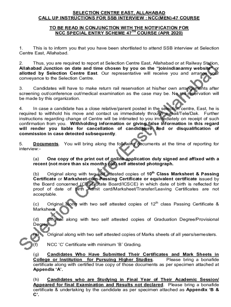 SELECTION Center EAST, ALLAHABAD Calls UP INSTRUCTIONS FOR SSB INTERVIEW : NCC(MEN)47 COURSE TO BE READ IN CONJUNCTION WITH THE NOTIFICATION FOR NCC SPECIAL ENTRY SCHEME 47TH COURSE (APR 2020)1. This