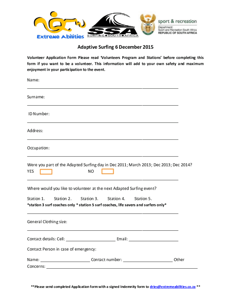 Adaptive Surfing 6 December 2015 Volunteer Application Form Please read Volunteers Program and Stations before completing this form if you want to be a volunteer. This information will add to your