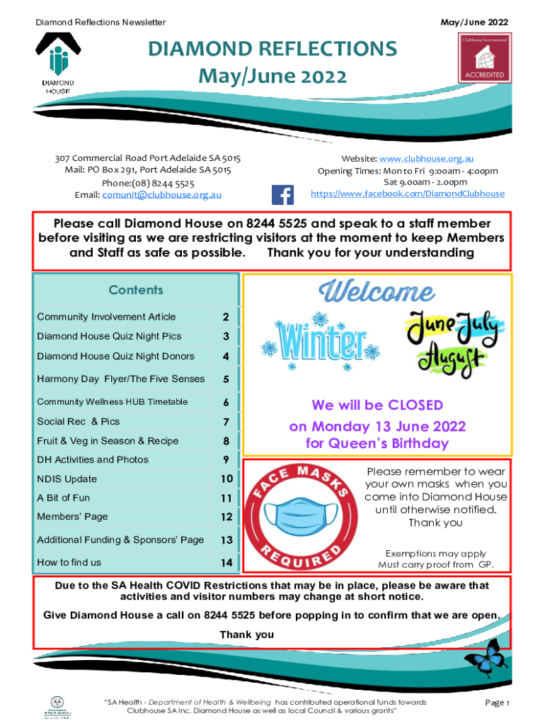 May/June 2022Diamond Reflections NewsletterDIAMOND REFLECTIONS May/June 2022307 Commercial Road Port Adelaide SA 5015 Mail: PO Box 291, Port Adelaide SA 5015 Phone:(08) 8244 5525 Email: comunit@clubhouse.org.auWebsite: