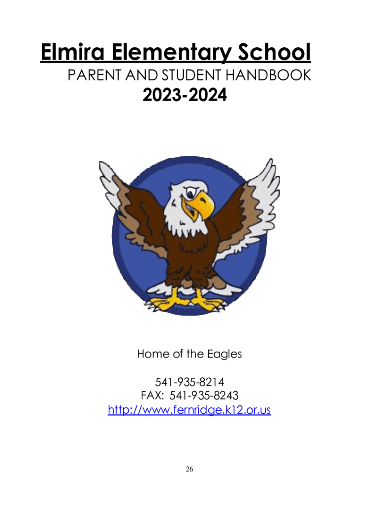 Elmira Elementary School PARENT AND STUDENT HANDBOOK20232024Home of the Eagles 5419358214 FAX: 5419358243 http://www.fernridge.k12.or.us262728Table of contents Section One: School Procedures Absences