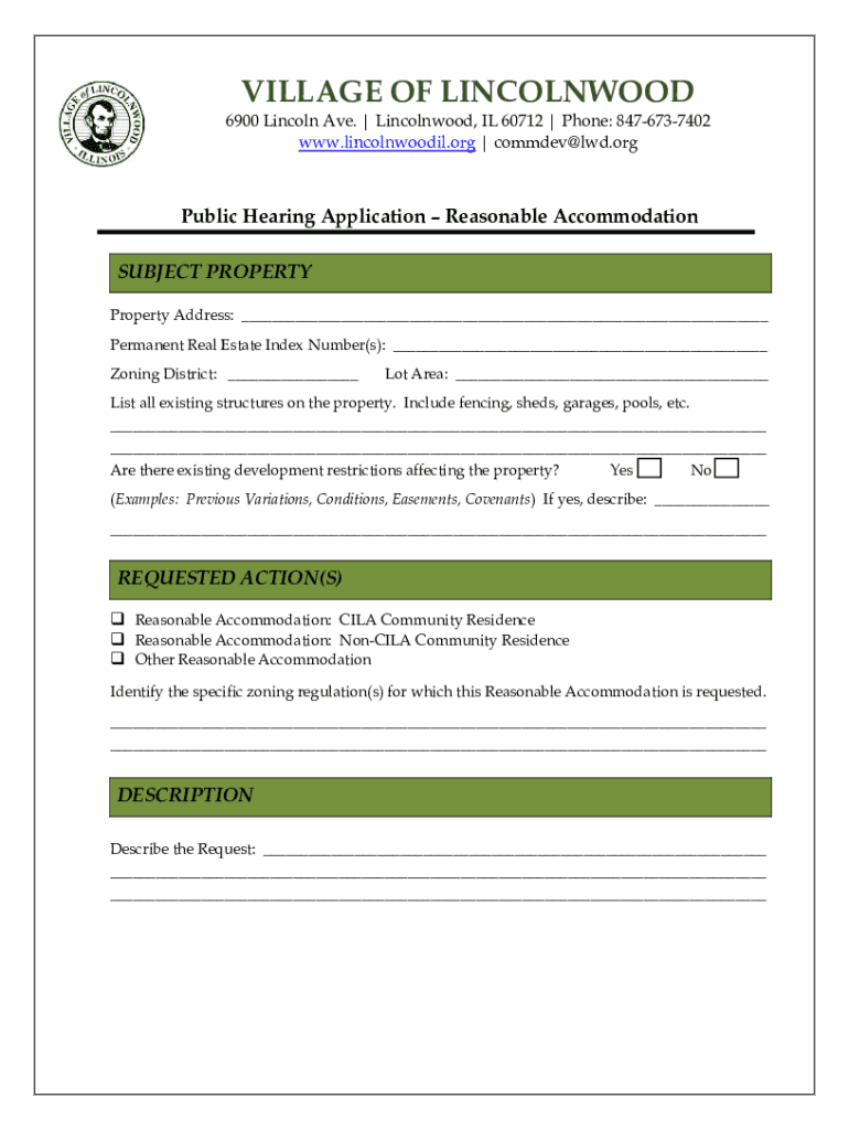 VILLAGE OF LINCOLNWOOD6900 Lincoln Ave. | Lincoln wood, IL 60712 | Phone: 8476737402 www.lincolnwoodil.org | commdev@lwd.orgPublic Hearing Application Reasonable Accommodation ACTION SUBJECT PROPERTY