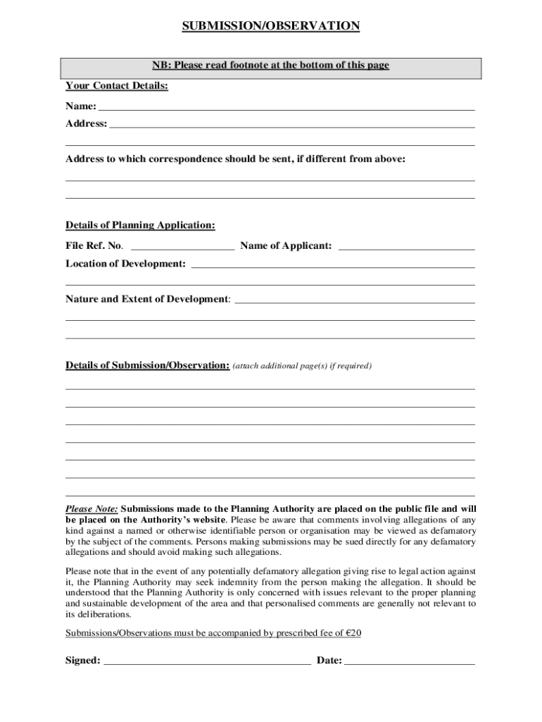 SUBMISSION/OBSERVATION NB: Please read footnote at the bottom of this page Your Contact Details: Name: ___ Address: ___ ___ Address to which correspondence should be sent, if different from above: