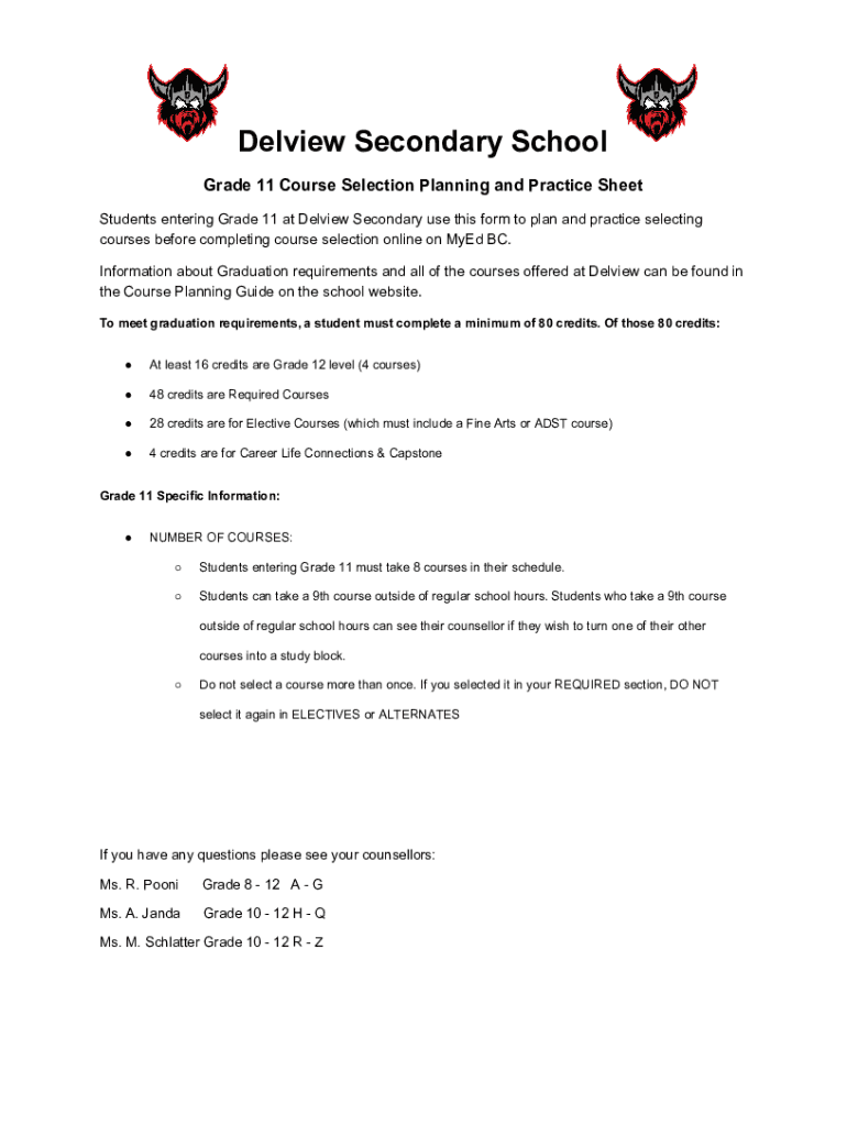 Del view Secondary School Grade 11 Course Selection Planning and Practice Sheet Students entering Grade 11 at Del view Secondary use this form to plan and practice selecting courses before completing
