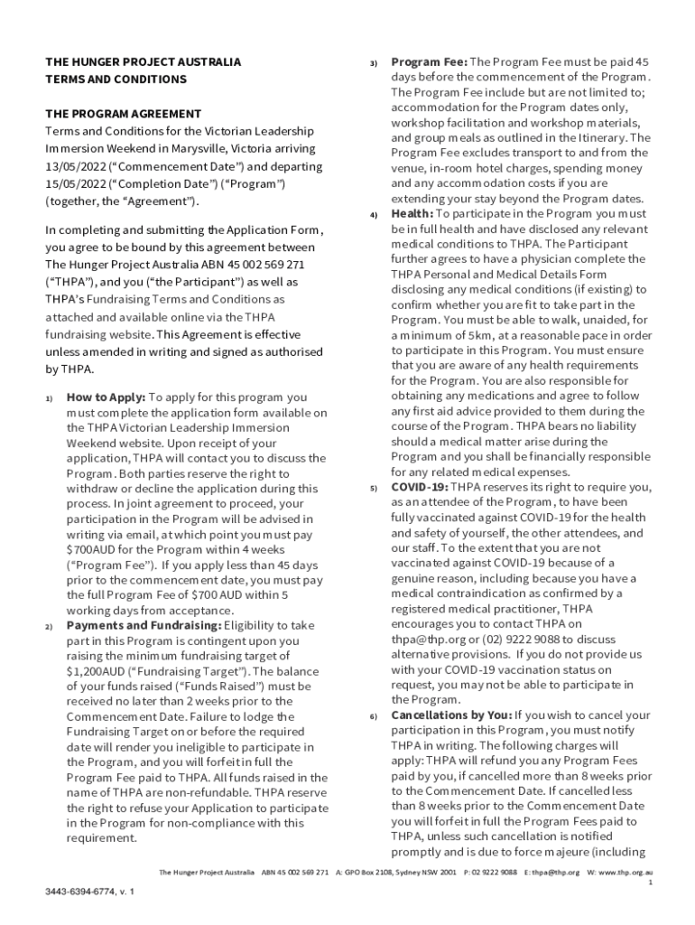 THE HUNGER PROJECT AUSTRALIA TERMS AND CONDITIONS3)THE PROGRAM AGREEMENT Terms and Conditions for the Victorian Leadership Immersion Weekend in Marysville, Victoria arriving 13/05/2022 (Commencement