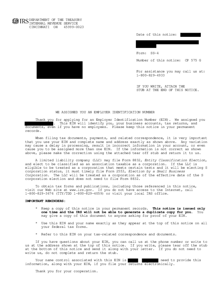 DEPARTMENT OF THE TREASURY INTERNAL REVENUE SERVICE CINCINNATI OH 459990023 Date of this notice:Form:SS4Number of this notice:CP 575 For assistance you may call us at: 18008294933 IF YOU WRITE, ATTACH