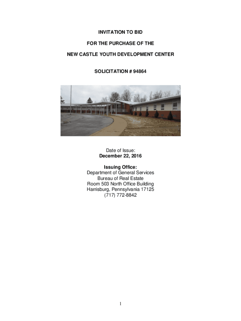 INVITATION TO BID FOR THE PURCHASE OF THE NEW CASTLE YOUTH DEVELOPMENT CENTERSOLICITATION # 94864Date of Issue: December 22, 2016, Issuing Office: Department of General Services Bureau of Real Estate