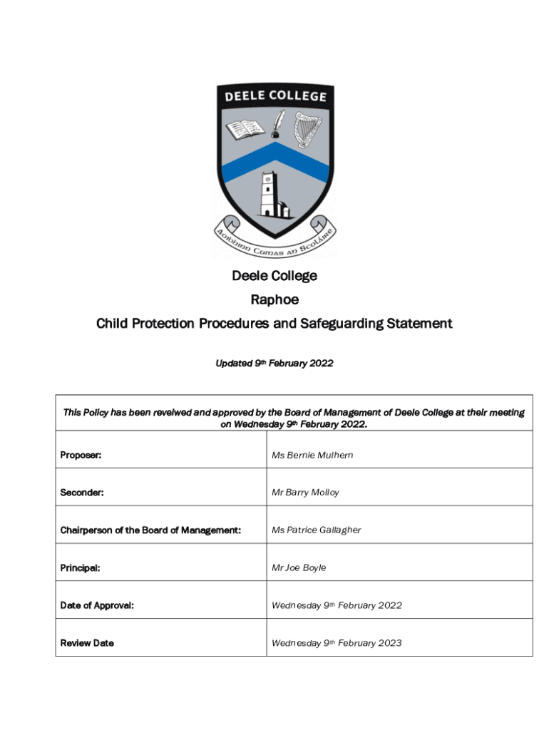 Updated 9th February 2022This Policy has been reviewed and approved by the Board of Management of Deere College at their