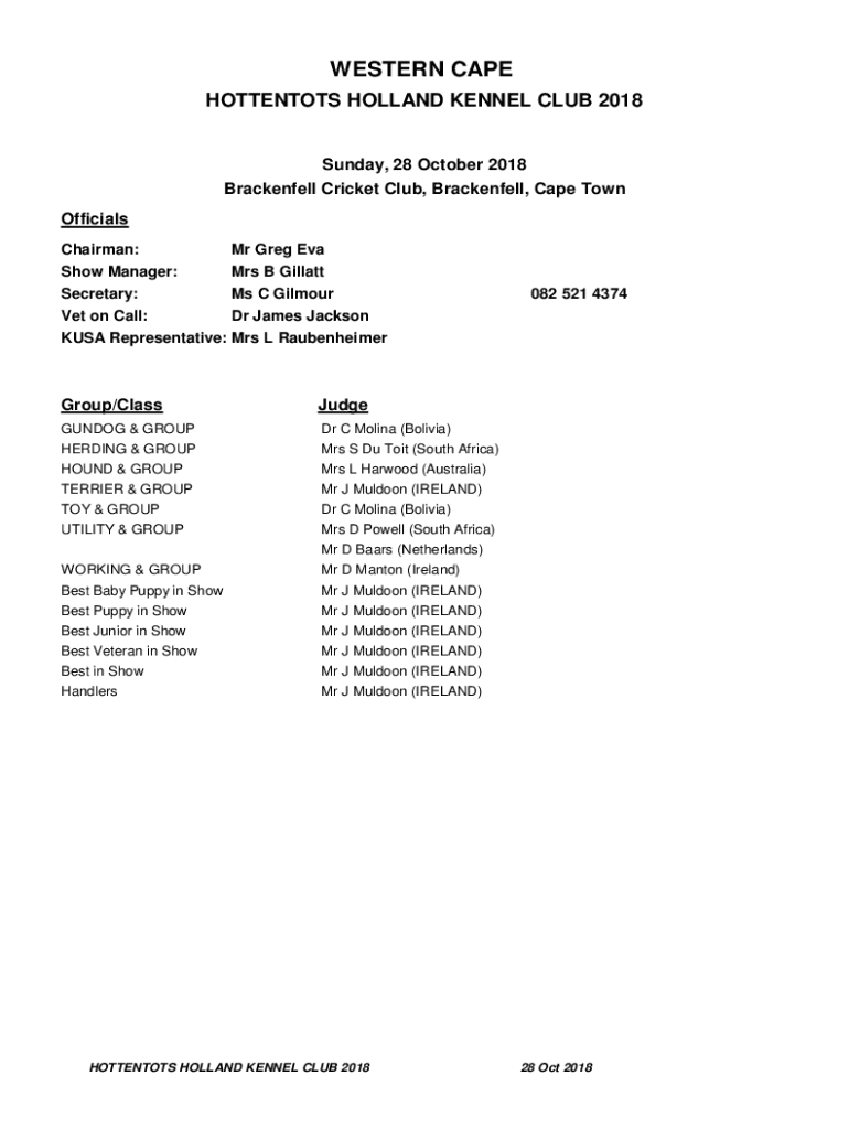 HOTTENTOTS HOLLAND KENNEL CLUB 2018Sunday, 28 October 2018