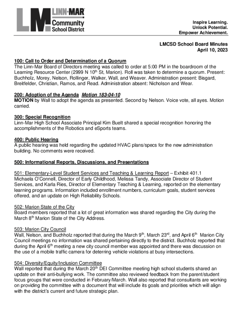 Inspire Learning. Unlock Potential. Empower Achievement.LMC SD School Board Minutes April 10, 2023 100: Call to Order and Determination of a Quorum The Linear Board of Directors meeting was called