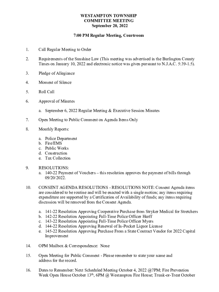 WESTAMPTON TOWNSHIP COMMITTEE MEETING September 20, 2022 7:00 PM Regular Meeting, Courtroom 1. Call Regular Meeting to Order2. Requirements of the Sunshine Law (This meeting was advertised in the