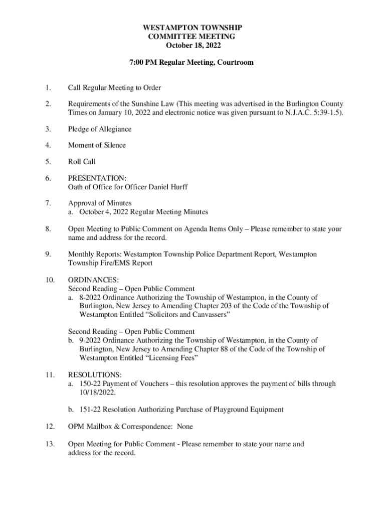 WESTAMPTON TOWNSHIP COMMITTEE MEETING October 18, 2022 7:00 PM Regular Meeting, Courtroom 1. Call Regular Meeting to Order2. Requirements of the Sunshine Law (This meeting was advertised in the Burlington
