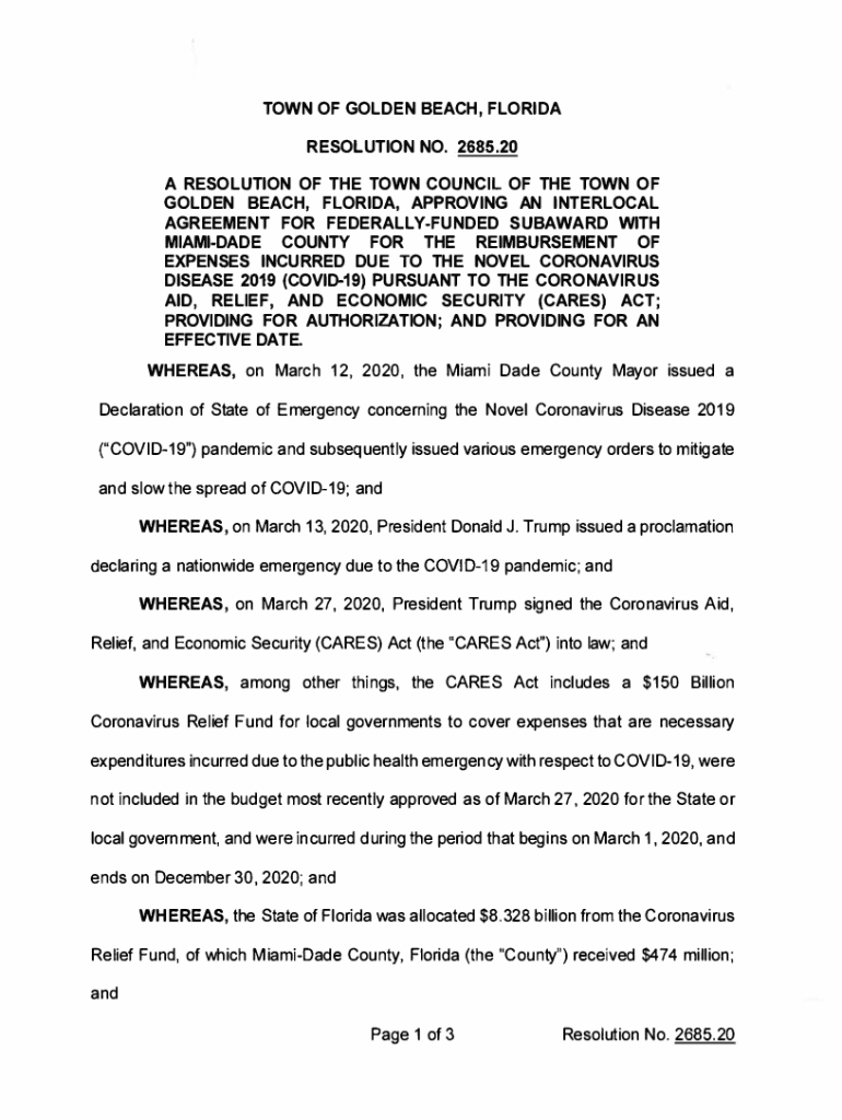 TOWN OF GOLDEN BEACH, FLORIDA RESOLUTION NO. 2685.20 A RESOLUTION OF THE TOWN COUNCIL OF THE TOWN OF GOLDEN BEACH, FLORIDA, APPROVING AN INTERLOCK AGREEMENT FOR FEDERALLYFUNDED SEAWARD WITH MIA MIDADE