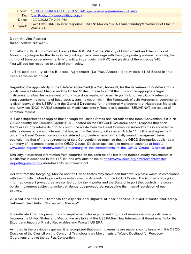 Page 1From: To: Date: Subject:\”JESUS IGNACIO LOPEZ OVER\” jesus.olvera@semarnat.gob.mx \”Jim Puckett\” jpuckett@ban.org 12/22/2022 7:42:01 PM Fwd: Fwd: BAN Counter response // ATTN: Mexico