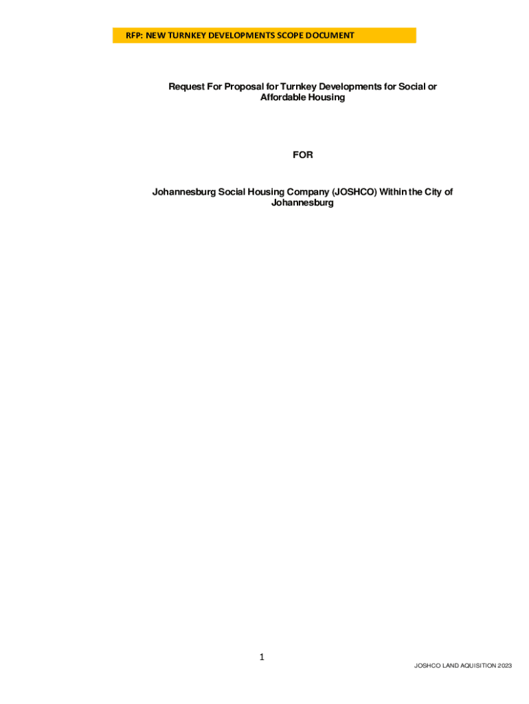 RFP: NEW TURNKEY DEVELOPMENTS SCOPE DOCUMENTRequest For Proposal for Turnkey Developments for Social or Affordable HousingFORJohannesburg Social Housing Company (JOSH CO) Within the City of Johannesburg1